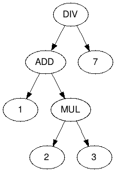 But, before, let us discuss a different issue: since our "assembler language" supports only one operation at a time, how can we use it to compute a "complex" expression such as (1 + 2 * 3) / 7? Just as we have seen during our parsing tutorial, we can model it with a tree: