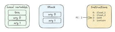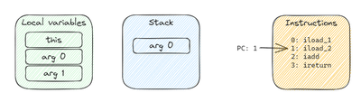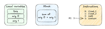 iload_<x>will push a local variable value on the stack. The variable must be a 32-bit integer. Thus, our method will push first the variable in slot #1 (i.e. the first argument), then the second one;iaddwill pop two 32-bit integer values from the stack, add them up, and push the resulting sum;ireturnwill pop the stack head, which will be a 32-bit integer, and return from the method with that value.