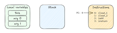 Finally, the JVM will keep a program counter (pc), i.e. an address of the next instruction to execute. At the beginning of the execution of a method, it will be zero, and after executing an instruction it will move ahead, but as we will see later some instructions can modify it.